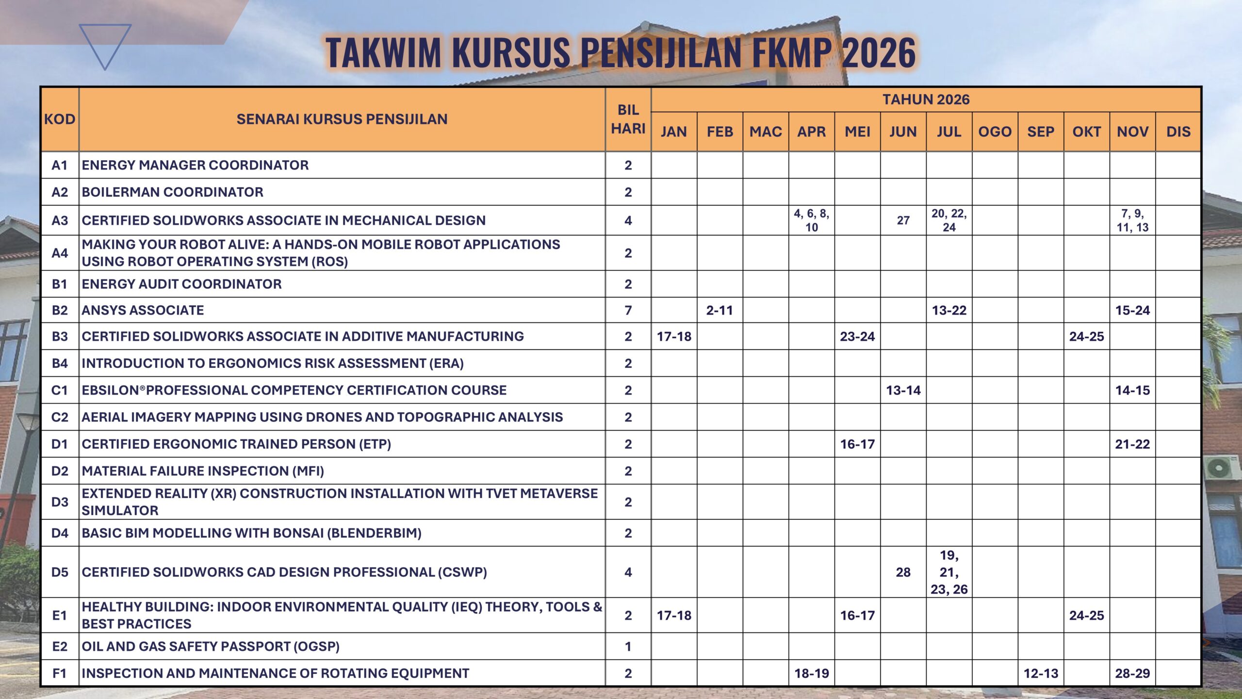TAKWIM KURSUS PENSIJILAN FKMP 2026Download Unit Pensijilan dan Latihan (UPaL)Fakulti Kejuruteraan Mekanikal dan Pembuatan, Universiti Tun Hussein Onn Malaysia, 86400 Parit Raja, Batu Pahat, Johor, Malaysia Tel: +6074537703 || Fax: +6074536080 || Email: upal@uthm.edu.my